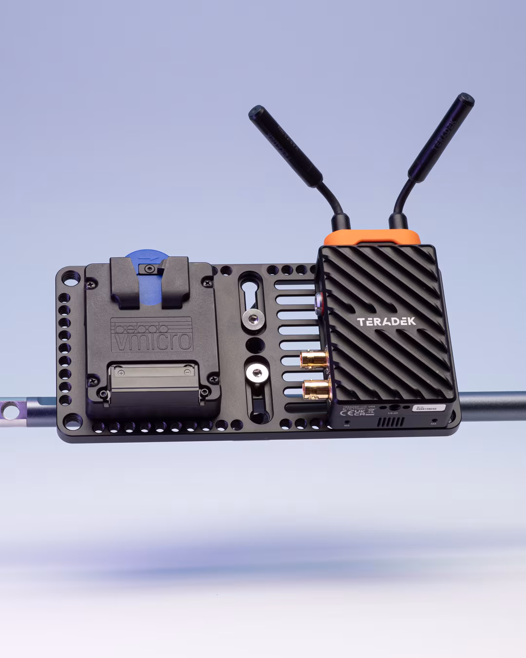 - Direct mount of one Teradek TX 750 LT (rear-side threads) or other ony Transmitter with 1/4″-20 UNC threads