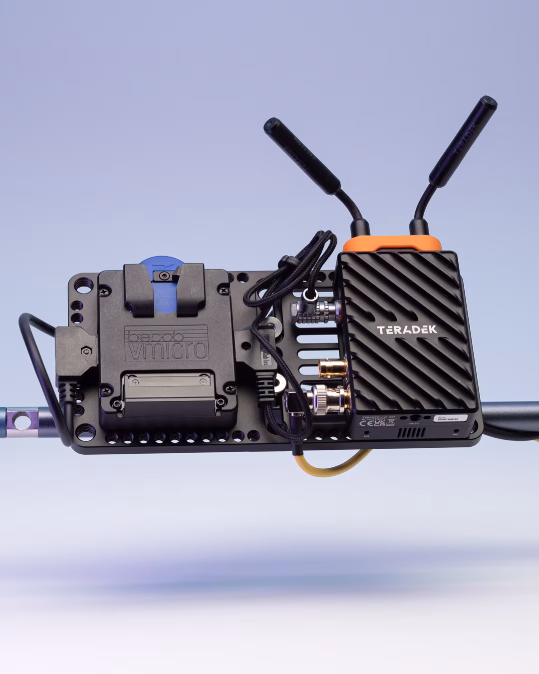 Cheese plate designed for mounting a Bebob Micro battery plate and a Teradek TX or a different transmitter on a small footprint.